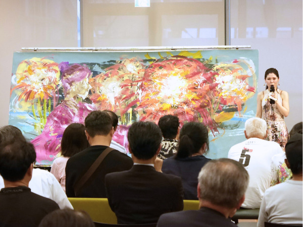 Colorhythm Risa(カラリズム・リサ)さんが、夏をモチーフにしたアートパフォーマンスを披露。夏の空と海から始まり、スイカ、ヒマワリと登場する夏の風物詩たち。ヒマワリが月となって、月明かりの福岡の街、さらに夏祭りの花火へと、音楽にあわせて次々に変化するキャンバスから目が離せませんでした。