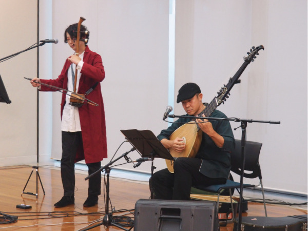 里地帰さん(二胡・和胡)と太田耕平さん(リュート)によるデュオ。中国の伝統楽器「二胡」に和紙を用いて新しくできた「和胡」と、16世紀ルネサンス期の古楽器リュートの共演は、バロック時代の名曲「カノン」でスタートしました。「ふるさと」など日本の童謡のほか、アンコールではバッハの「G線上のアリア」を披露。低音部のリュートの響きに、和胡の郷愁を誘うメロディーが乗り、日本とヨーロッパ、ルネサンスから昭和へと、地域と時を超えたクロスオーバーな音楽が広がりました。
