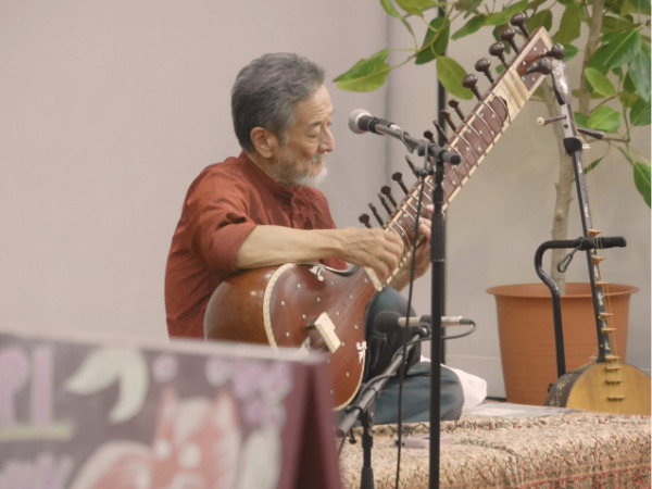 インド古典音楽の弦楽器・シタールを弾きながら、日本初の民族音楽プロ演奏家の若林忠宏さんが登場。楽器の特徴や音階などの説明を交えながら演奏しました。16本の弦から神秘的でエキゾチックな音色が響き渡り、まるで異国の宮廷にいるような雰囲気に包まれました。