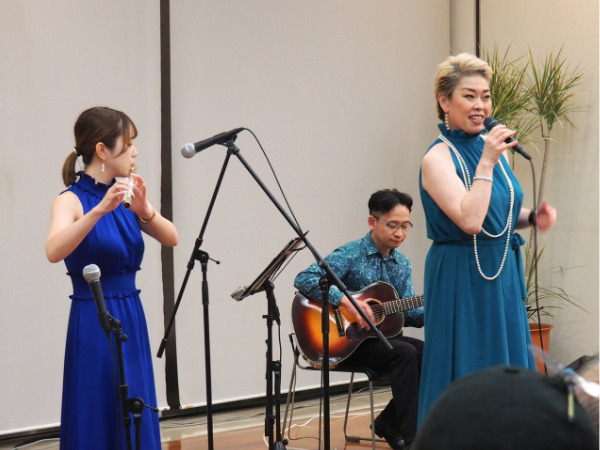 ボーカル・轟かおりさん、ギター・石川雄一さんのデュオに、フルート・安部由梨佳さんが加わり、「L-O-V-E」や「La vie en rose」などジャズスタンダードを演奏。轟さんの歌声は、しっとりと落ち着いた感じから、パワフルで華やかな歌声と曲調に合わせて変わり、これに寄り添った、ギター、フルートが織りなす音色が大人の魅力あふれるステージでした。