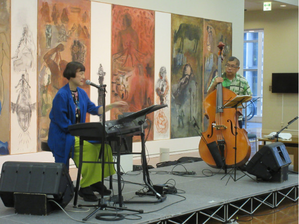 小森陽子さん(オルガン)と浦ヒロノリさん(サックス)によるデュオ。小森さんのエネルギッシュなファンキーオルガンサウンドと、自由に駆ける浦さんのサックス。「ジャズって何だろう?」と、解説を交えながらの即興演奏に会場は釘付け。「愛燦燦」ではサックスの温かくも切ない音色にしんみりとなり、「A列車で行こう」ではリズミカルな演奏に手拍子と、多彩なジャズが楽しめるステージでした。