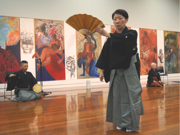 主人公を演じる「シテ方」、声楽担当「謡」、楽器担当「囃子方」と、宝生(ほうしょう)流の3名が登場。演目は、源平の戦場となった島に義経の霊が出る「八島」や、舞う天女の「羽衣」、妖しき精霊「殺生石」。「囃子方」が打つ大鼓と掛け声に、物語を表現する「謡」に合わせ、「シテ方」が扇子を持ってすり足で舞を演じました。場面に応じて、扇子が刀や楯、鎧、兜などに変幻。物語や能面の解説も交えながらの充実した舞台でした。