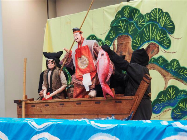今回、同保存会が披露したのは、大漁を祈った演目「戎舞(えびすまい)」。人形一体を、「頭と右手」「左手」「両足」の3名で担当し、太鼓の音と2名の太夫の語りに合わせていきいきと動きます。最後は、福の神えびす様が船出し、大きな鯛を釣り上げ、メデタイ、メデタイと幕を閉じました。