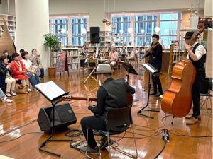 トランペット・窪みさとさん、ピアノ・長尾義明さん、ウッドベース・岩本大輝さんからなるトリオ「Little Melody's Jam」が出演。童謡「ぞうさん」「赤とんぼ」や「エーデルワイス」など、子どものころから耳にした懐かしの名曲をジャズの調べに乗せて演奏。弾むようなスウィングのオリジナル曲も披露していただきました。アンコールでは、最初のスローなテンポとは打って変わり、軽快なリズムで駆ける「ぞうさん」でフィニッシュしました。
