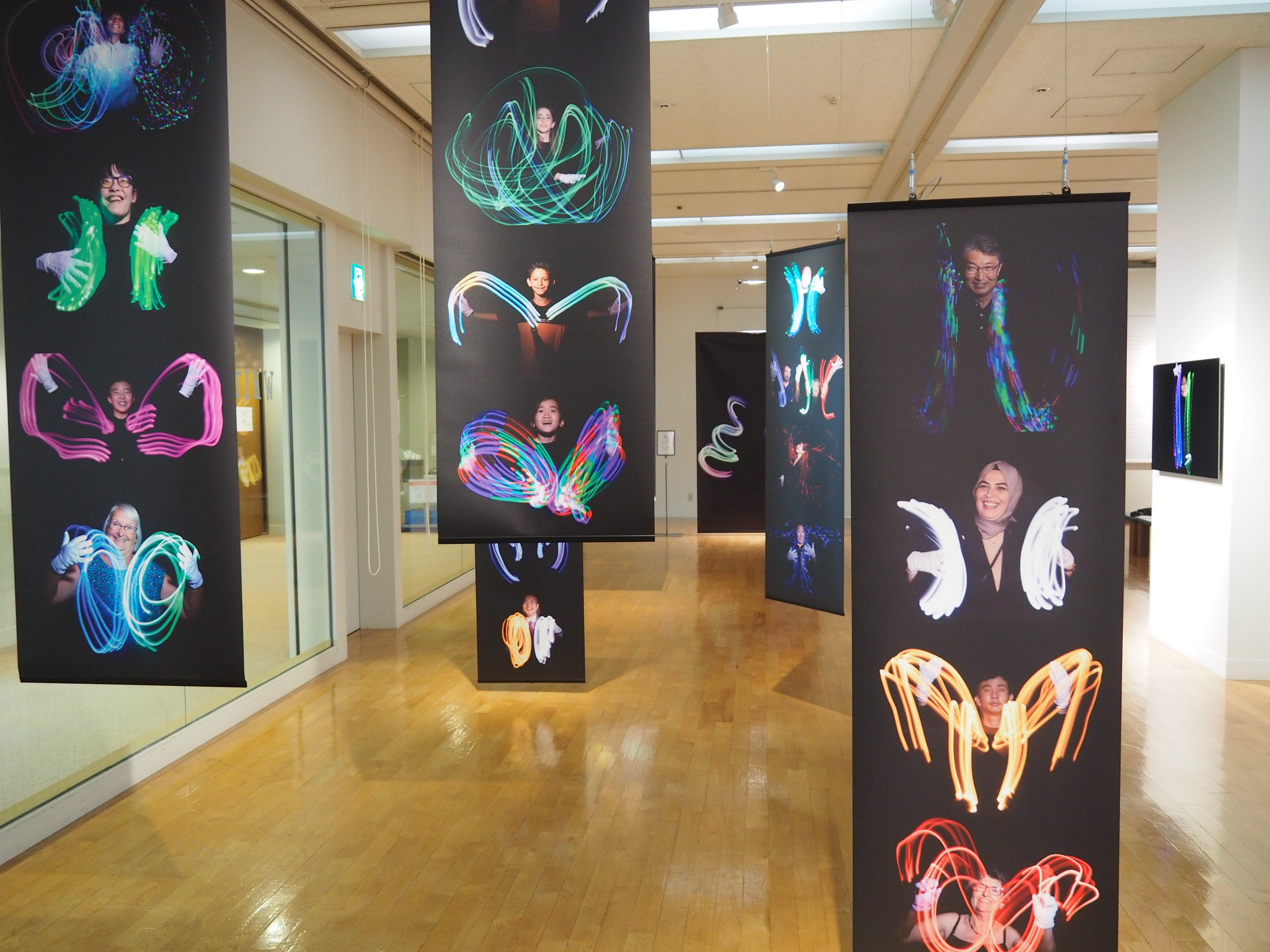 9月11日(木)~16日(火)にかけて開催した写真展では、ホワイトハンドコーラスNIPPONの手歌パフォーマンスを撮影した写真作品や、触れることのできる立体展示を陳列。来場者は、光と影のコントラストや手の動きの軌跡に見入ったり、実際に手歌を体験できるコーナーで手を振ったりなど、五感を通じて音楽を体験していました。海外からの来場者も多いアジア美術館。ギャラリー内には、視覚障害者のための音声ガイドに加え、英語と韓国語の音声ガイドも設置し、インクルーシブな写真展となりました。