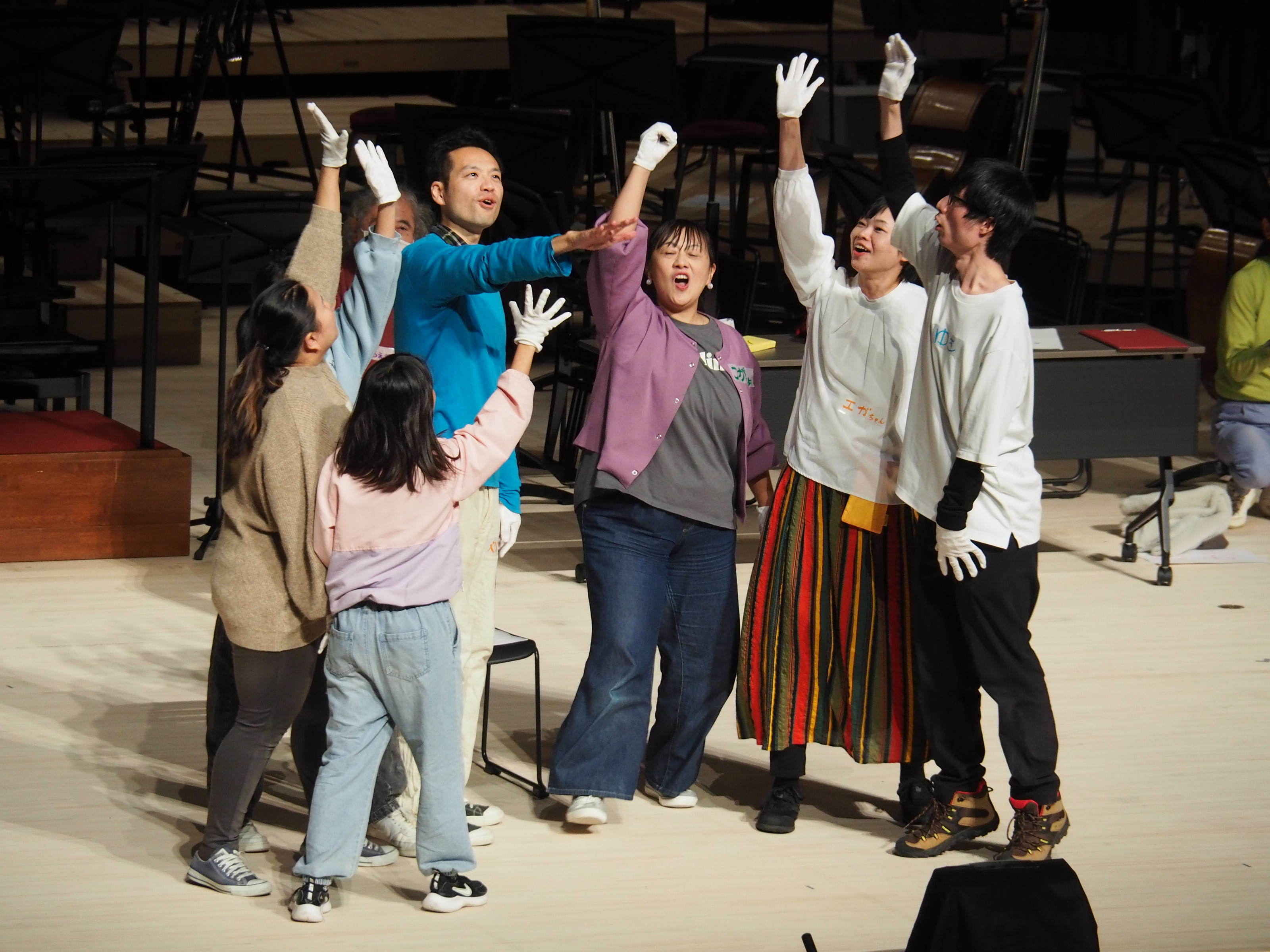 九州交響楽団との合同練習前の最後の練習では、手歌監修・ソリストの井崎哲也さんと講師の馬場昌子さんが指導。なわとびや玉入れのジェスチャーなど、声を使わず身体表現のみで行うウォーミングアップを経て、サイン隊と合唱団が心を一つにしました。