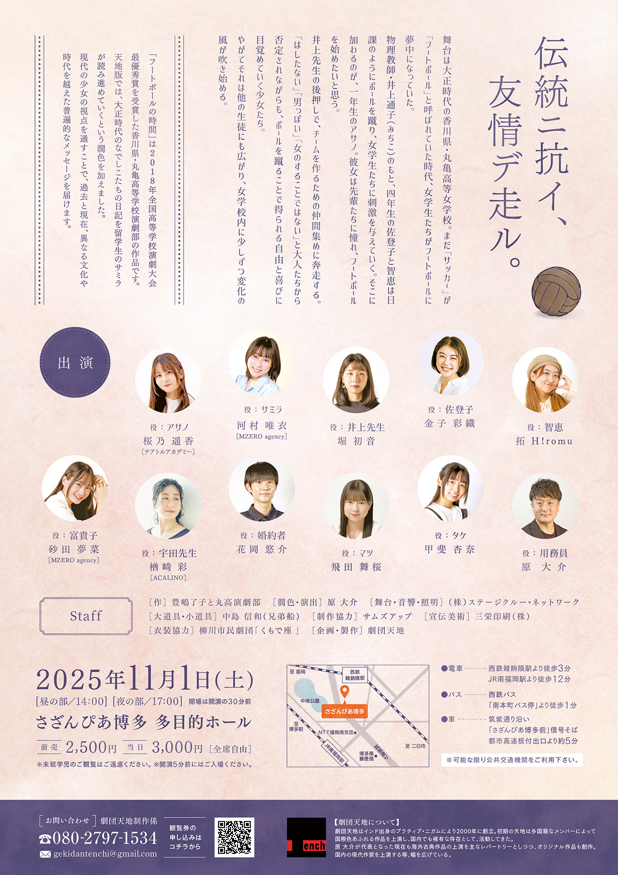「フートボールの時間」は全国高等学校演劇大会で最優秀賞を受賞した香川県・丸亀高校の作品です。サッカーがフートボールと呼ばれていた時代の女学生たちの物語です。天地版では留学生・サミラが女学生たちの日記を読み進めていく潤色を加え、現代の少女の視点を通すことで過去と現在、異なる文化や時代を超えた普遍的なメッセージを届けます。福岡の女子サッカーチーム「福岡J・アンクラス」とのコラボレーションも展開します。