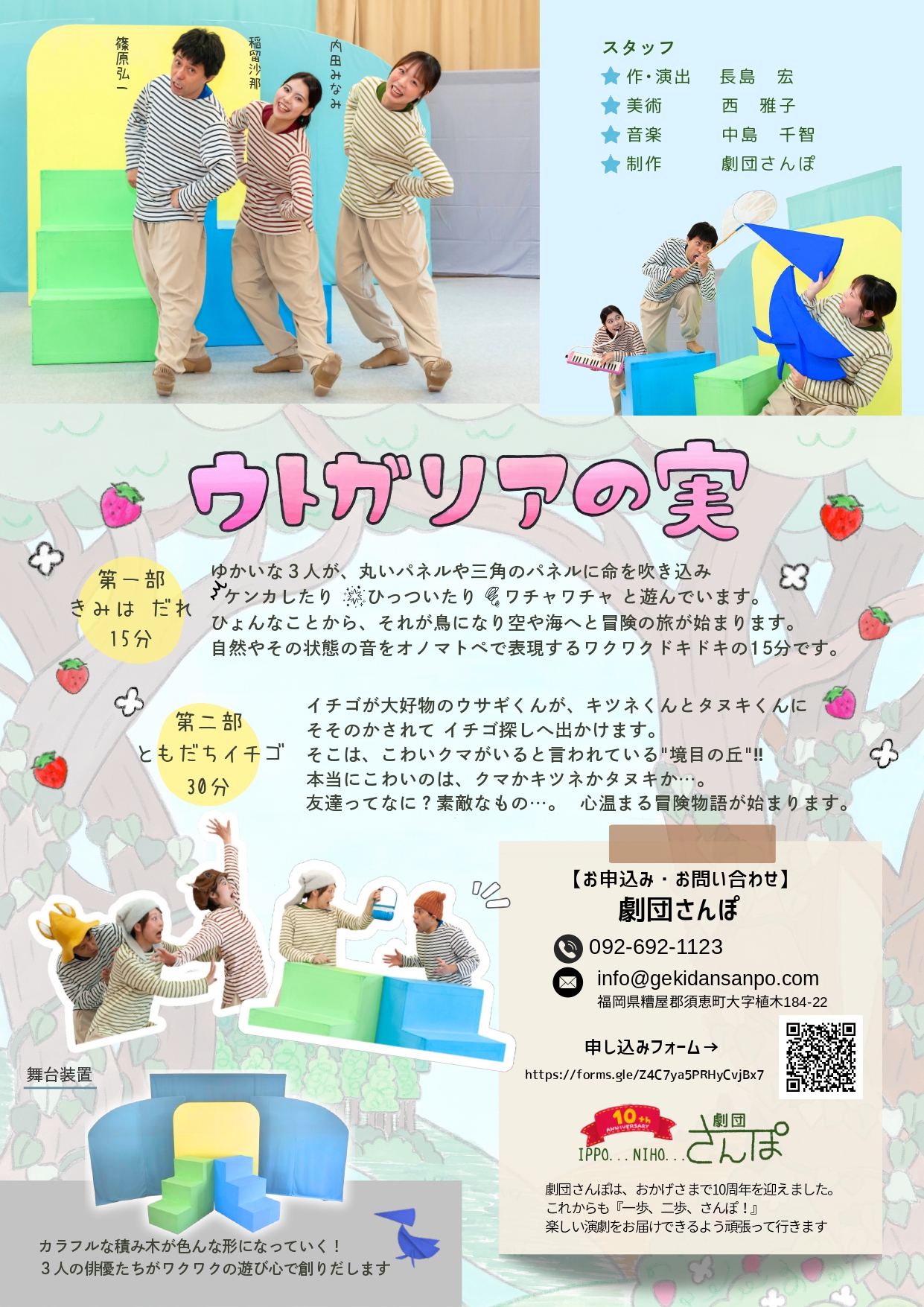 おかげさまで『劇団さんぽ』は、10周年を迎えました。「ウトガリアの実」は、その10周年の年2025年1月に完成しました。こうやって新作を創り上演していけるのも観てくださる方、応援してくださる方々がいるからこそと劇団員一同感謝を込めてこの公演を実施します。「ウトガリア」逆から読むと…。心がほっこりする時間を一緒に楽しんでください。