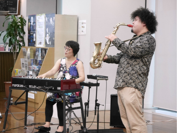 小森陽子さん(オルガン)と浦ヒロノリさん(サックス)によるデュオ。小森さんのエネルギッシュなファンキーオルガンサウンドと、自由に駆ける浦さんのサックス。「ジャズって何だろう?」と、解説を交えながらの即興演奏に会場は釘付け。「愛燦燦」ではサックスの温かくも切ない音色にしんみりとなり、「A列車で行こう」ではリズミカルな演奏に手拍子と、多彩なジャズが楽しめるステージでした。