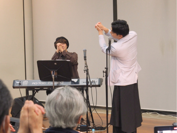 手のひらだけで演奏する「手笛(てぶえ)」奏者のなかしま拓さんと、ピアニストの冨永隆治さんが出演。軽やかなピアノと手笛のふくよかで澄んだ音色で、ジャズスタンダード、昭和の名曲、ポップスなど全9曲を演奏。MCでは、手笛の吹き方のレクチャーも行われ、拍手と笑いに包まれる和やかな時間となりました。手のひらだけとは思えない圧巻の演奏を堪能しました。