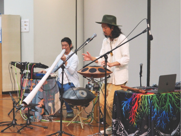 世界の路上とフェスでの演奏歴を持つ2人、「ハンドパン」奏者・Kokuさんと「デジュリドゥ」奏者・mabsohさんが登場。それぞれお一人での演奏後、楽器についての解説をしていただきました。ハンドパンは円盤のような金属の打楽器、デジュリドゥはユーカリの木からなる大きな笛のような楽器です。最後のセッションでは、跳ねるようなハンドパンの音色を支えるデジュリドゥの低音という組み合わせに、ループ音も加わり、新感覚な音との出会いになりました。