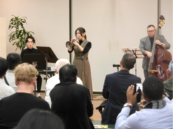 トランペット・窪みさとさん、ピアノ・長尾義明さん、ウッドベース・岩本大輝さんからなるトリオ「Little Melody's Jam」が出演。童謡「ぞうさん」「赤とんぼ」や「エーデルワイス」など、子どものころから耳にした懐かしの名曲をジャズの調べに乗せて演奏。弾むようなスウィングのオリジナル曲も披露していただきました。アンコールでは、最初のスローなテンポとは打って変わり、軽快なリズムで駆ける「ぞうさん」でフィニッシュしました。