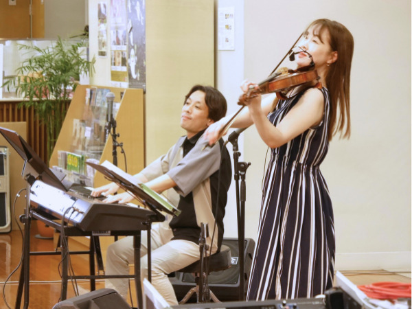 ピアニストの橋本芳さんと、バイオリニストの尾崎めぐみさんによるデュオ・SYMMETORIA(シンメトリア)。久保田早紀さんの「異邦人」やカーペンターズの「Close to You」など、お馴染みのポップスのほか、スイングを誘うジャズ演奏もあり、会場をぐっと魅了しました。