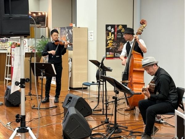 スウィングトリオ「Trio du Hot Club de FUKUOKA」が出演。3人の手にかかれば、クラシック曲もポップス曲も、小粋なスウィングナンバーに変身。ロマの伝統音楽とスウィングジャズが融合した、思わずステップを踏みたくなるようなリズムに、会場は晴れやかな雰囲気でした。