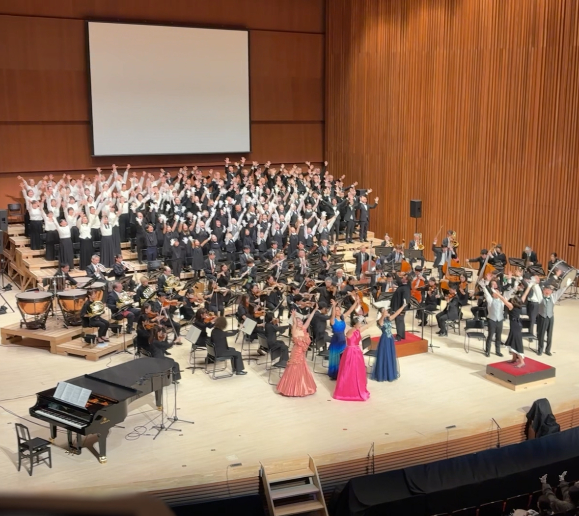 そして迎えた最終楽章、今回は指揮者がサイン隊とオーケストラにそれぞれ1人ずつ、ソリストも各パートにソリストと手歌ソリストという布陣でダイナミックに展開します。指揮者の辻博之さんのパワフルな指揮と九響のフルオーケストラが紡ぐ美しい音色と圧倒的スケール感、さらにソプラノ・アルト・テノール・バスで構成する総勢約80人の九響合唱団の歌声が響きます。