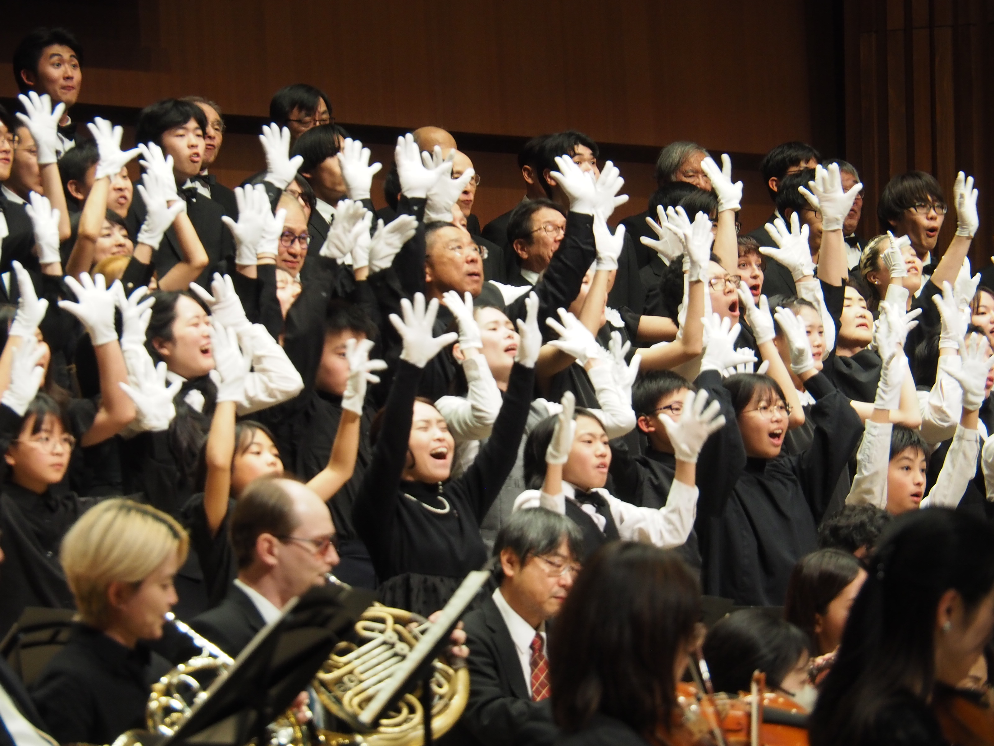 多様な出演者がステージ上で一つになる瞬間、来場時に配布した白い手袋を着け第一部の手歌ワークショップで習った手歌で客席も“歓喜の歌”を共に奏でました。まさに会場全体が一つになって歓びが響き渡りました。